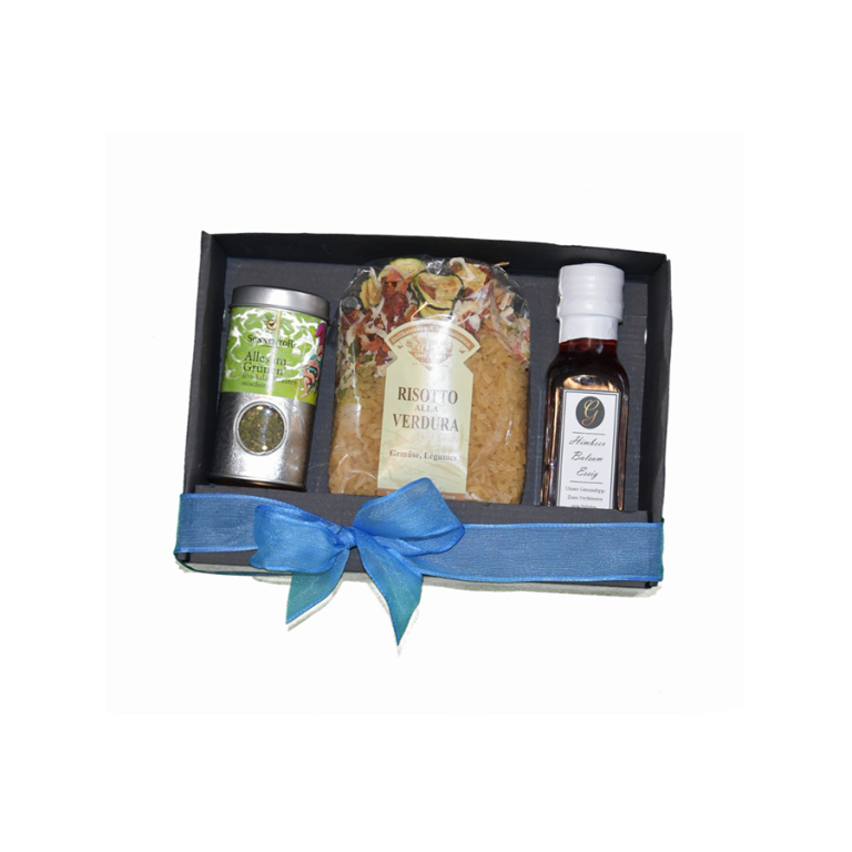 Dieses Geschenk-Set enthält ein Gemüserisotto, alles im Grünen Kräuter von Sonnentor und einen feinen Himbeer Balsam Essig 0.1 l